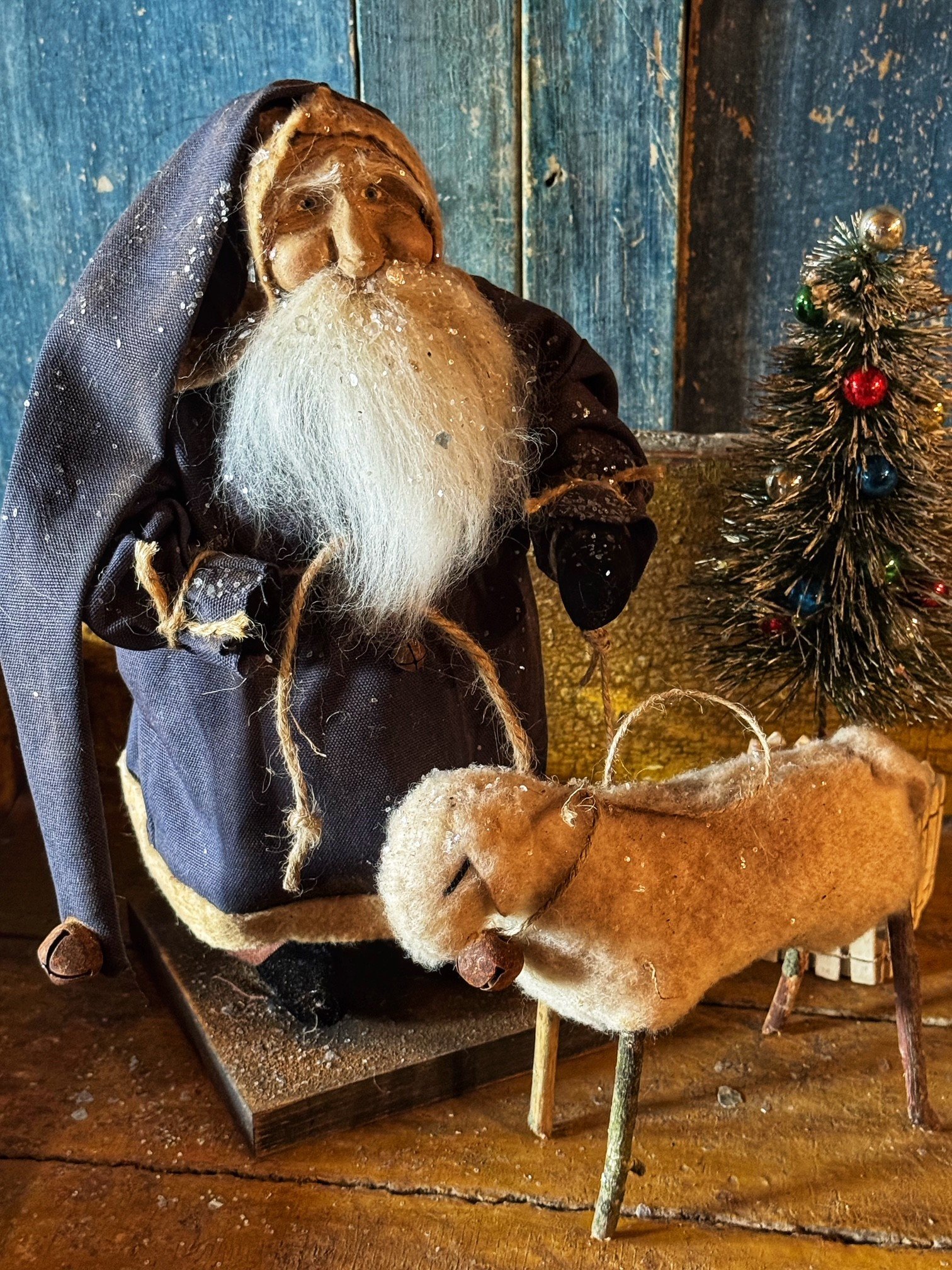 2026 Small Santa wearing a navy coat with sheep