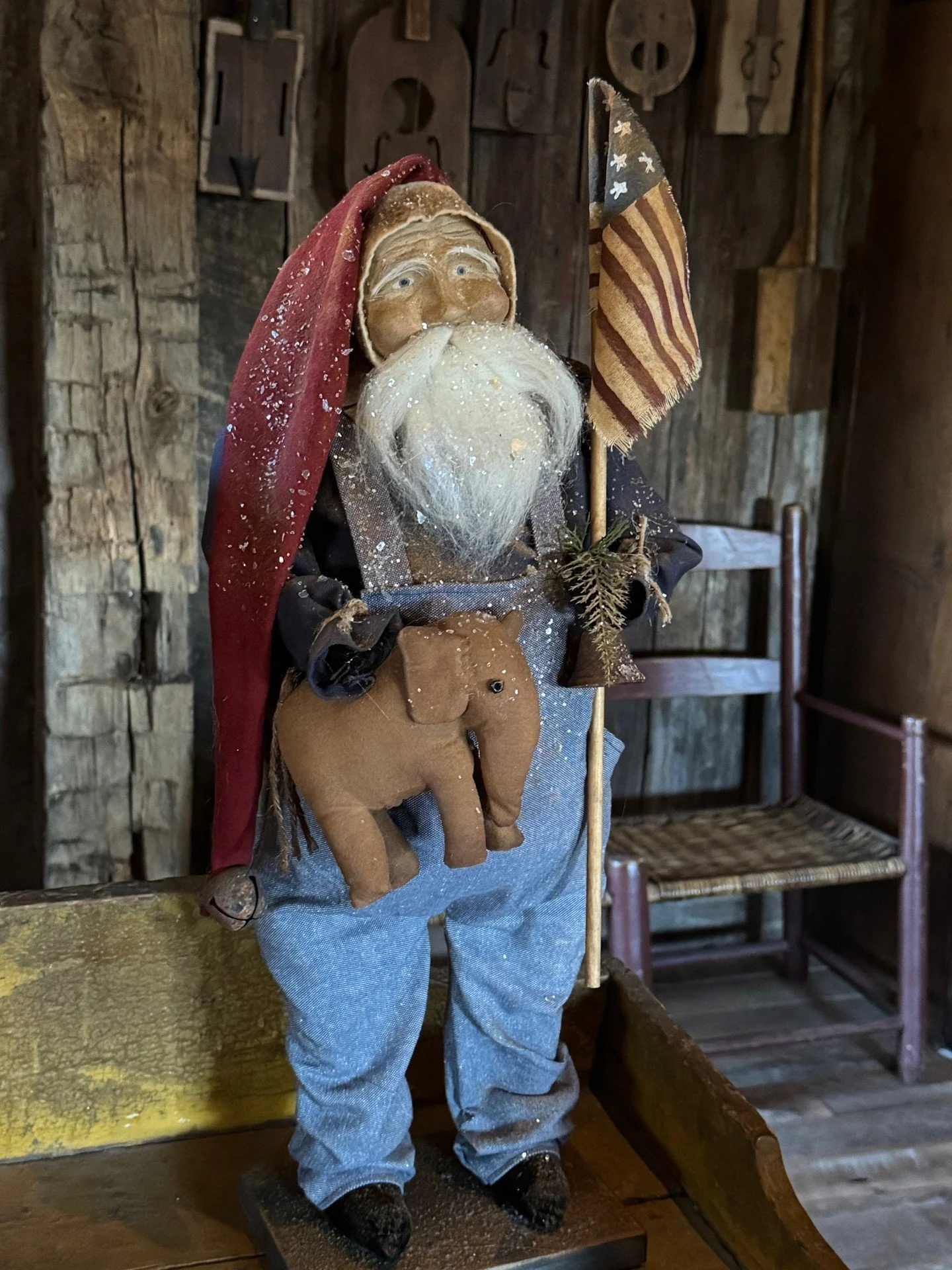 2026 Santa weaing denim overalls holding an elephant and flag